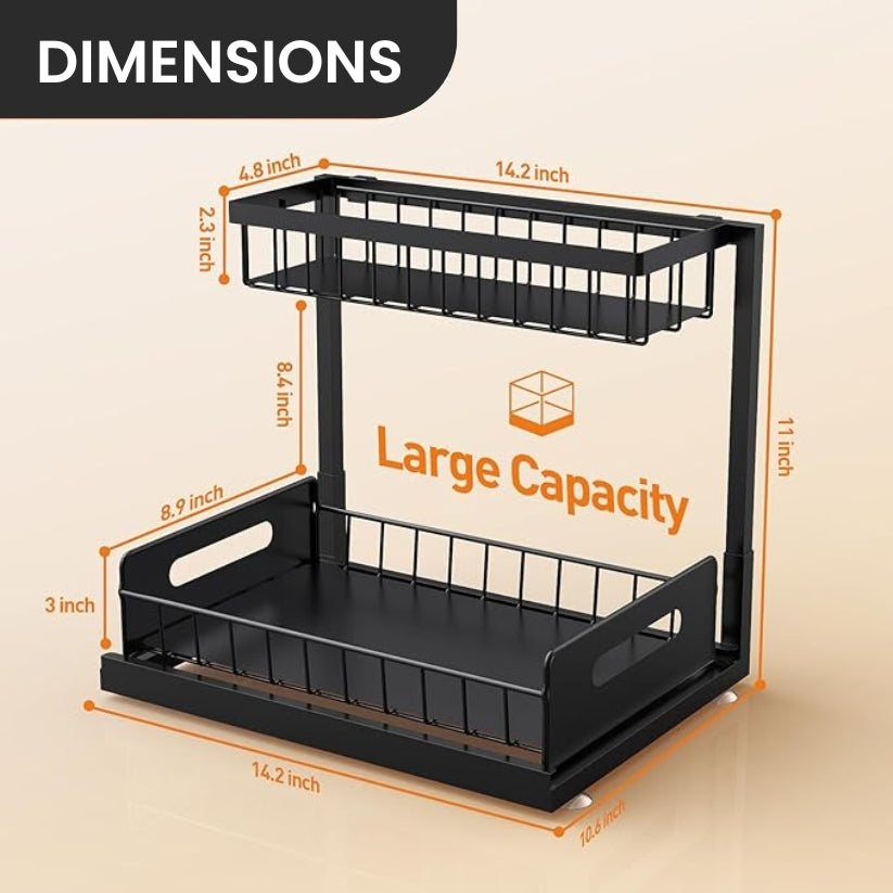 • 2-Tier Vertical Storage – Store more in less space with layered shelves for everything from sponges to large cleaning bottles.