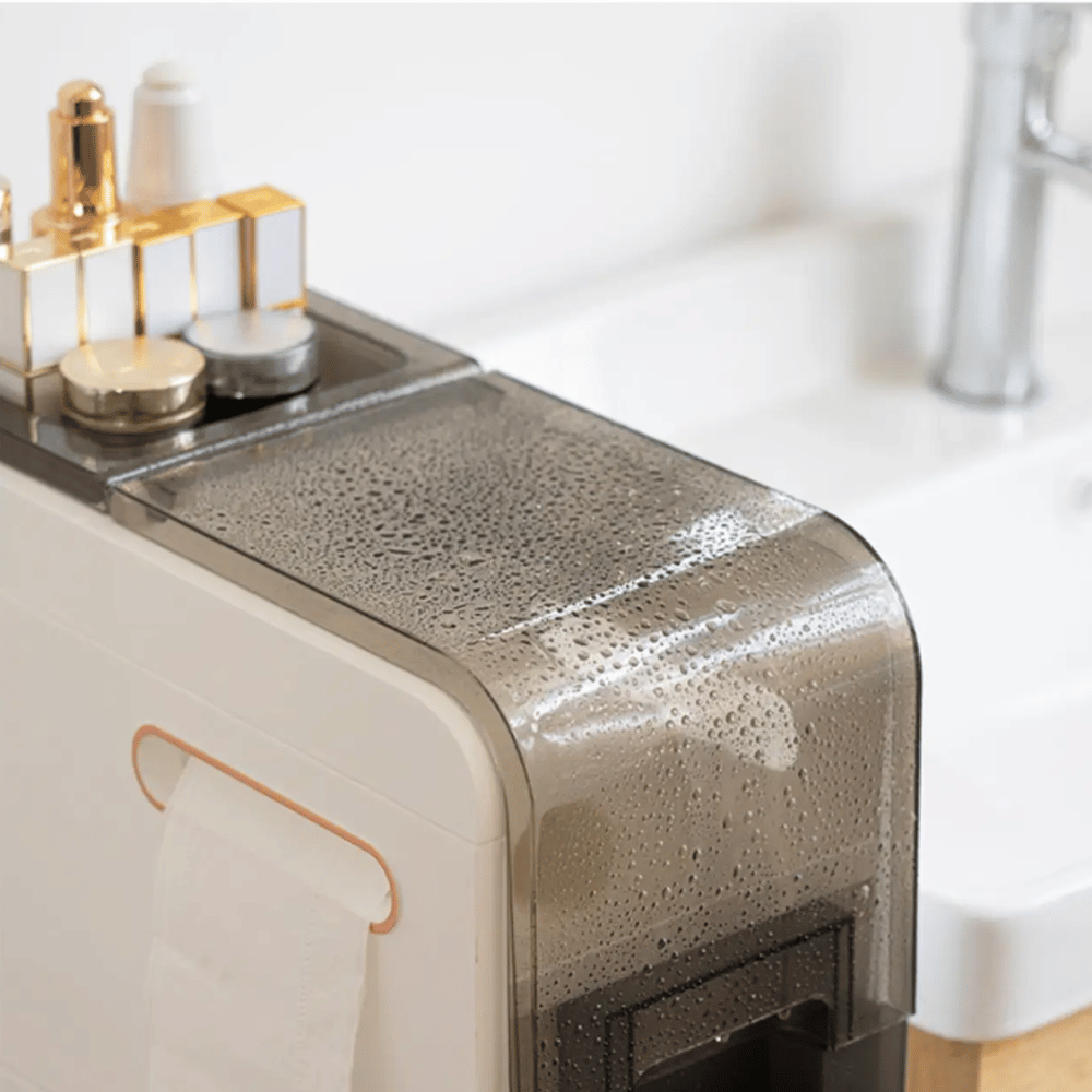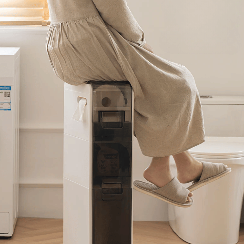 • The storage features 3 sliding drawers, a main storage space that has a place through which toilet paper can be placed, and 1 uncoated support for other cosmetic products.