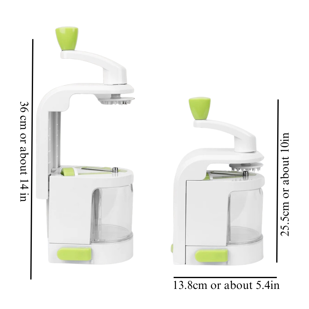 • When not in use, the dimension of the Veggie Spiral Twister is 13.8 cm x 25.5 cm or about 5.4 in x 10 in.